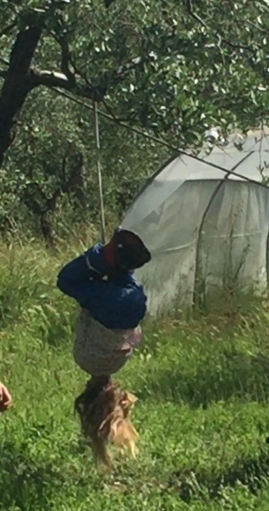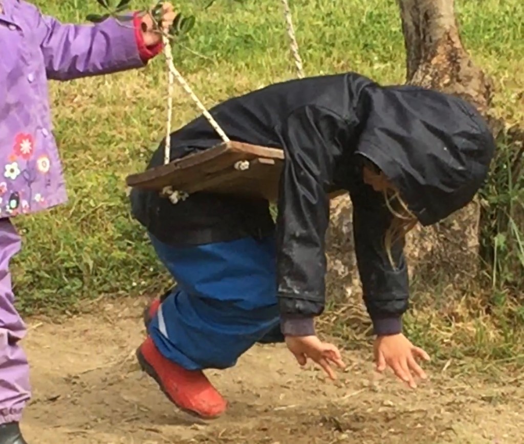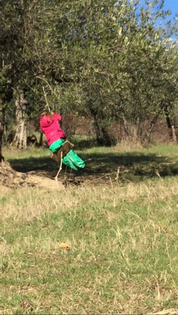 Un pezzo di ramo duro e levigato è attaccato con una corda ad un ramo di un albero. Il ramo levigato è attaccato più o meno ad altezza testa. Di solito bimbi e bimbe si aggrappano con le mani e le braccia tese, sollevano un po’ i piedi dopo essersi dati una spinta. In questo caso L. Si è aggrappata al ramo con le gambe incrociate e si è appesa a testa all’ingiù.