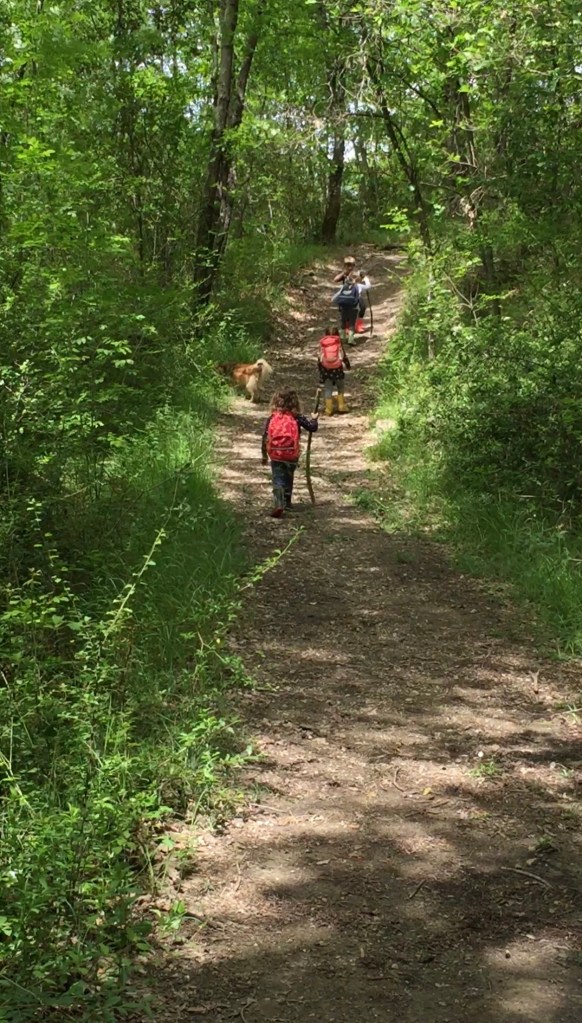 In questa foto in cui si vede camminare un gruppetto di bambini e bambine di tre, quattro cinque e sei anni. Il sentiero è in salita ma nel bosco fa fresco ed i passi sono veloci e sicuri. Il gruppo è completamente avvolto nel verde e sul sentiero compaiono macchie di luce.