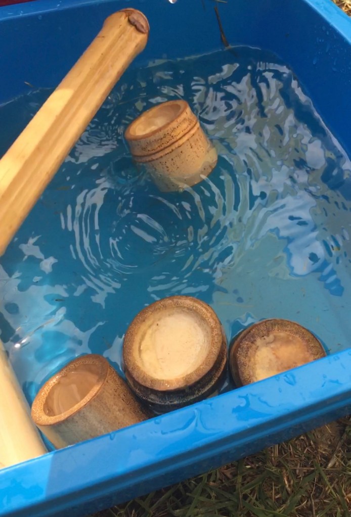 Mi affascina osservare un’invenzione musicale così semplice. Bicchierini di bambù che galleggiano a testa all’ingiù.